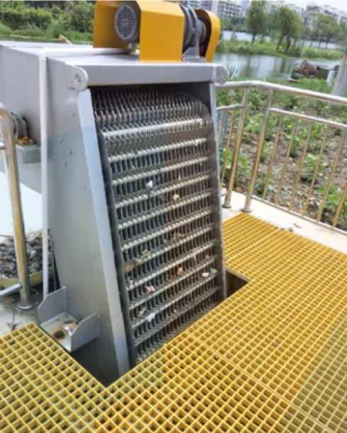 由于耙齿结构设计合理,使耙齿链携带杂物到达上端反向运动时,前后相连的两排杷齿之间产生相对自清理运动,促使杂物依毕重力脱落;同时设备后部设置一对与耙齿链运动方向相反的尼龙刷,以保证每排耙齿运动到该位置时都能得到彻底的刷净。