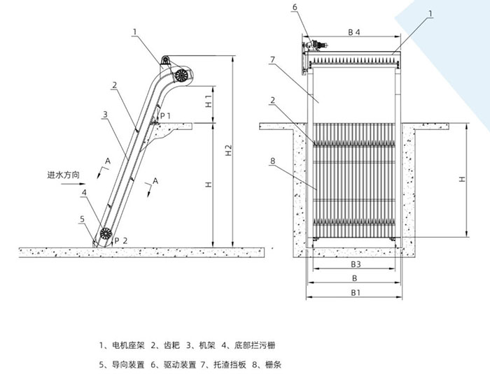 该设备采用背降式、回转链式, 由齿耙板和固定栅条组成过水栅面,当污水流过时,大于栅隙的杂物被拦截。齿耙板的耙齿深入栅条的间隙中, 当驱动装置带动牵引链作回转运动时,耙齿把截留在栅面上的杂物自下而上带至出清口,当耙齿自上向下转向运动时,杂物依靠重力自行脱落,从卸料口中落入输送机内,然后外运或作进一步的处理。