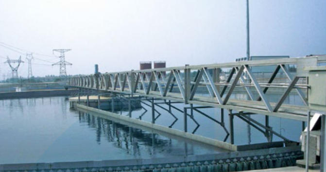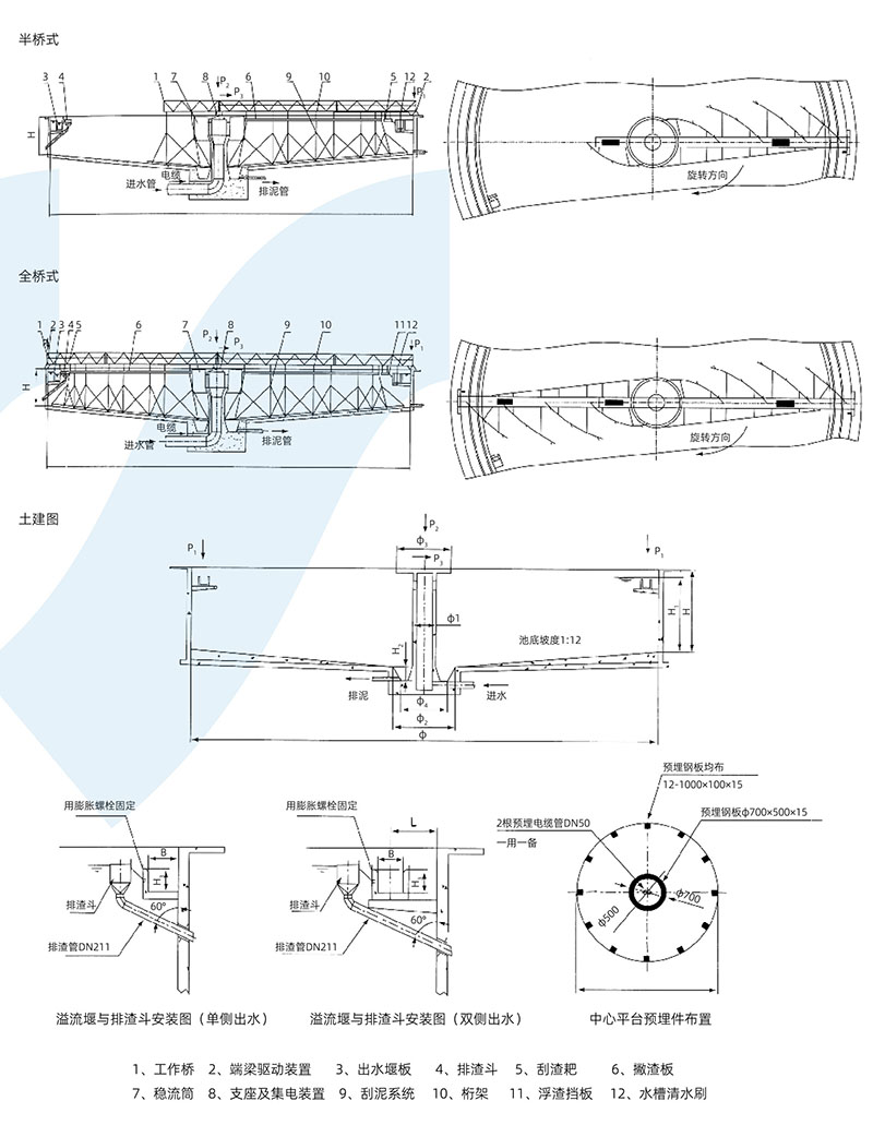 中心支座由固定支承座、回转轴承和机架组成,可同时承受轴向力、径向力和倾覆力矩。集电装置采用滑环式集电装置,由集电环和电刷架组成。浮渣刮板、浮渣耙板、浮渣漏斗组成排渣机构,能有效地清除水面浮渣。工作桥是连接中心支座和行走端梁的大型部件,其上有走道板和栏杆,钢梁的下面连接刮泥结构,排渣机构等,在行走装置的带动下来完成刮泥、排渣工作。