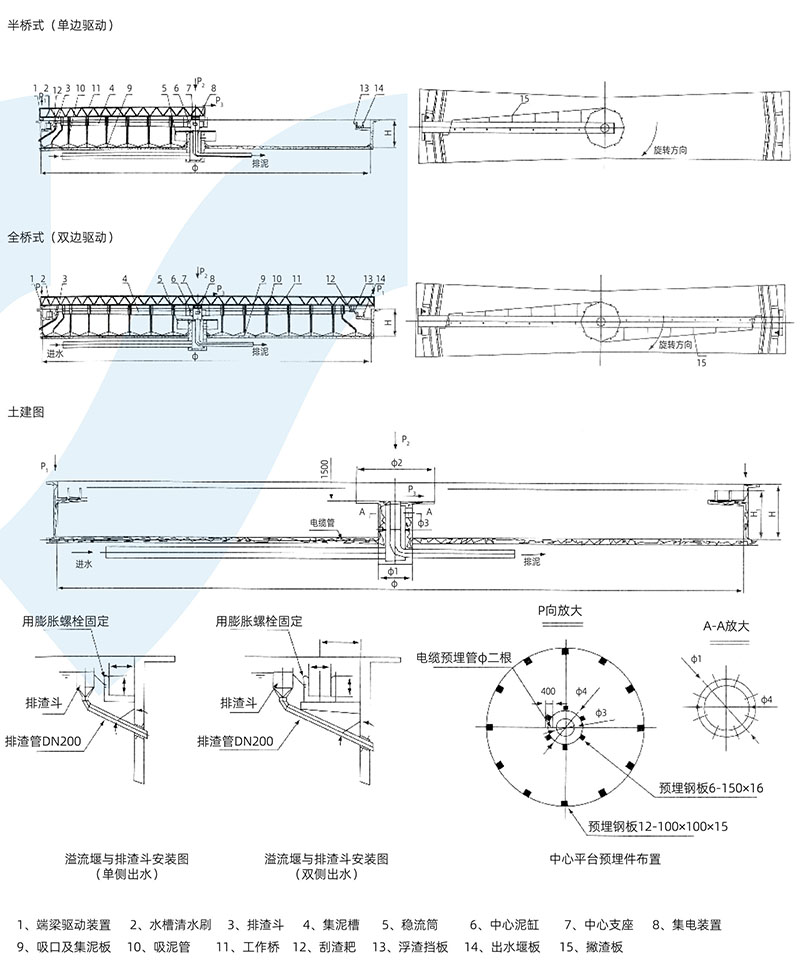该设备采用周边传动,污水从池中心的进水管流入,经稳流筒扩散后,均匀地向周边呈辐射状流出,呈悬浮状的污泥经沉淀后沉积于池底,驱动装置带动工作桥架沿周边旋转,并带动吸泥管系统和集泥刮板转动,刮板将污泥刮集后由啜泥管依靠池内静水压抽吸至集泥槽内排入中心泥缸,再通过中心排泥管排出池外,水面的浮渣通过旋转搬渣装置导入排渣斗内排出池外。而上清液则通过三角形出水堰板滋入出水槽内排出。