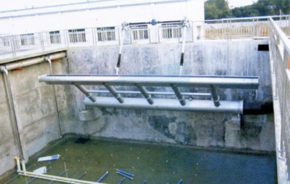 该设备采用旋转式、电动推杆式,安装于反应池或沉淀池内,工作时由驱动装置驱动推杆,使滗水器以一定速度渐渐下降至水面(在规定的行程范围内),使堰口浸入水面下,上清液从堰口流入,经集水支管汇集至总管后排出,停止时同样由推杆将滗水器提起,使堰口抬离水面以上,从而完成一个滗水的过程。