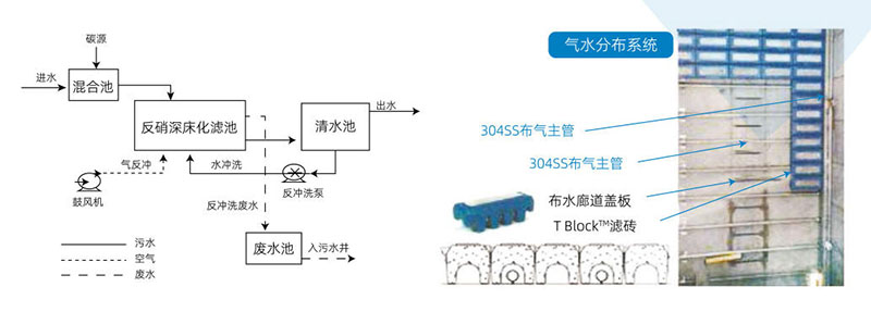 可靠性: TN把关技术,因国内污水处理厂出水水质波动较大,滤池可对TN达标起到把关作用,出水水质稳定可靠,无生物膜残留;终身免维护:反硝化深床滤池采用气水分布滤砖,无易损耗件,气水分布块具有不堵塞、不老化和不腐蚀的特点。