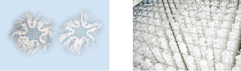 组合式填料集软性和半软性填料之优点,克服了两者的弊端,在污水的生化处理过程中为较理想的产品。它是有塑料环为依托作为骨架,负载着维纶丝,维纶丝紧固在塑料环上,在污水中丝束分布均匀,易生膜、换膜,并对污水浓液的适应性好,广泛应用于各种污水及废水处理。
